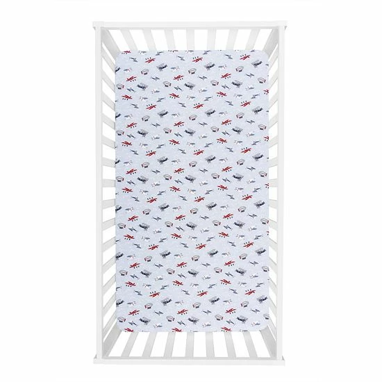 The Sky Traveler Deluxe Flannel Fitted Crib Sheet by Trend Lab is 100% brushed cotton and features a scatter print with airplanes, helicopters and blimps soaring through the sky. The balance of blue, red, and gray palettes makes this the perfect sheet for your baby boy!