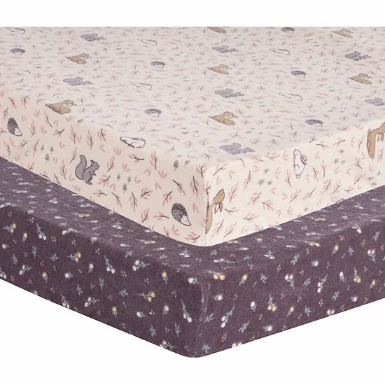 Make your little one’s playard cozy with Trend Lab’s Autumn Floral 2 Pack Flannel Playard Sheets. The 100% brushed cotton flannel fabric has just the right amount of padding for a little extra cushion in the playard. One features a white bunny, gray squirrel, purple hedgehog, and light taupe deer frolicing in eggplant purple leaves and mushroom scene on a lilac background. The other features a floral scatter print in a pale blush, golden yellow and blue haze on a moonscape purple background.