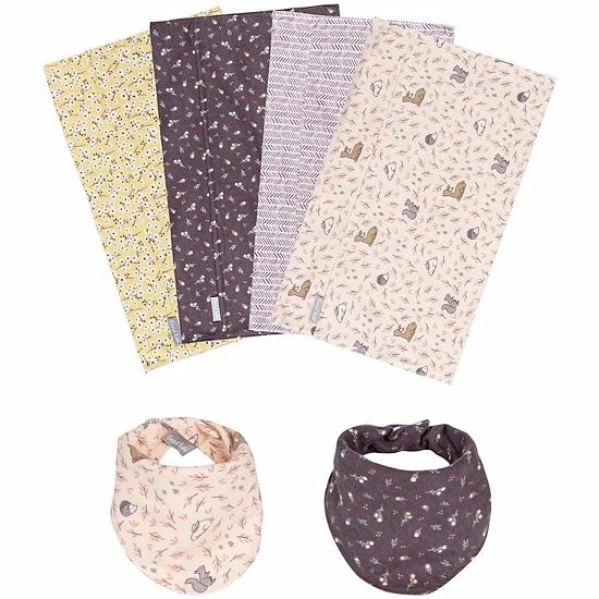 - 6-piece set includes: 2 bibs & 4 burp cloths
