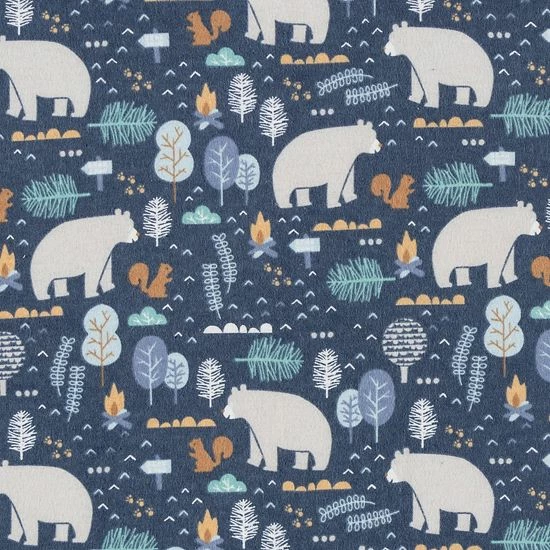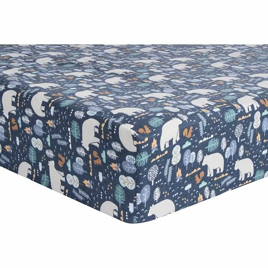 The Bear Crossing Deluxe Flannel Fitted Crib Sheet by Trend Lab is 100% brushed cotton and features a rustic bear print wandering through a woodsy scene in a blue palette with touches of brown and glacier gray.