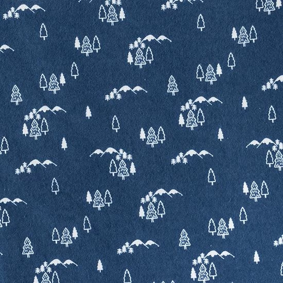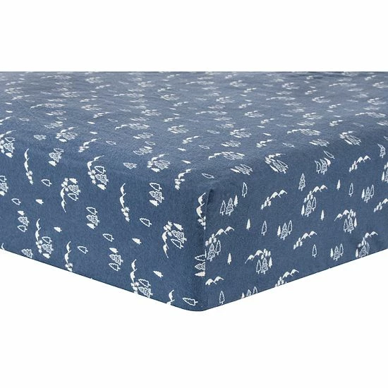 The Mountains Deluxe Flannel Fitted Crib Sheet by Trend Lab is 100% cotton and features a mountain and tree sketch print in white on a navy background.