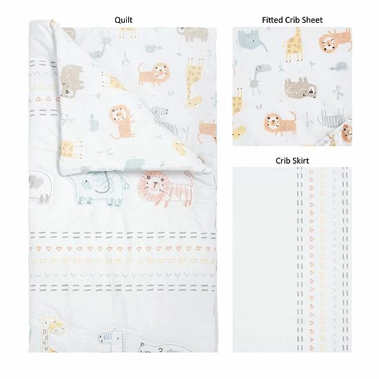 - 1 Reversible Quilt, 1 Crib Skirt, 1 Fitted Crib Sheet