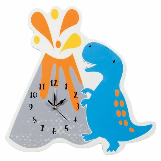 Complement any room with the stylish Dinosaur Volcano Clock by Trend Lab. This clock features an adventurous blue dinosaur and a gray volcano with orange and yellow lava. Black numbers add the finishing touch. Mounting hardware is attached to the back for easy hanging. Runs on one AA battery (not included). Clock measures approximately 14 1/2 in x 15 in.