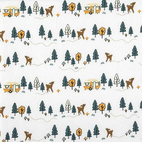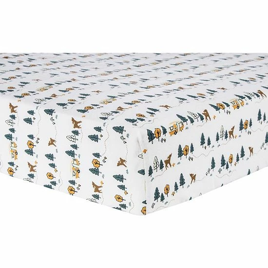 The Forest Campers Deluxe Flannel Fitted Crib Sheet by Trend Lab is 100% brushed cotton and features a woodland camping scene with an adorable deer buddy wondering through the pines in green, brown, orange, beige and black.