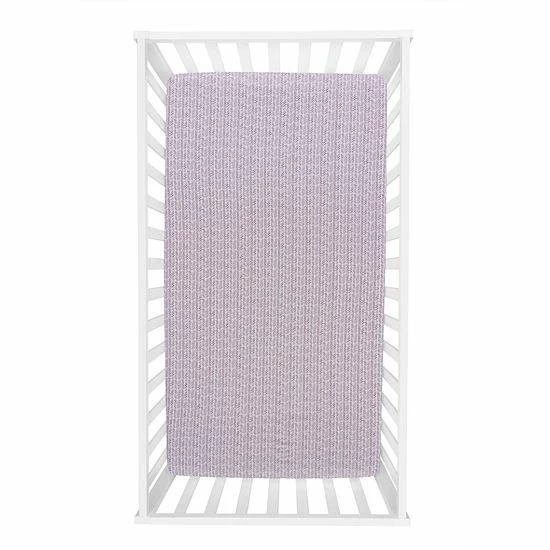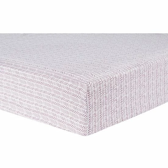 The Lilac Herringbone Deluxe Flannel Fitted Crib Sheet by Trend Lab is 100% brushed cotton and features a directional herringbone pattern in lilac on a white background.