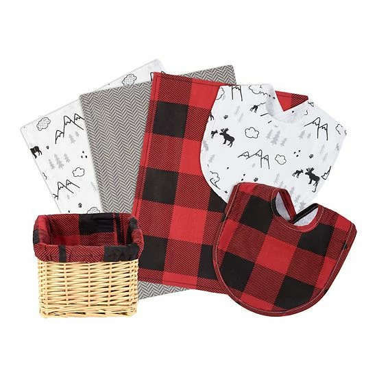 Welcome your little one with this lumberjack moose-themed 7-piece gift basket that features two deluxe bibs, three burp cloths and a reusable basket.