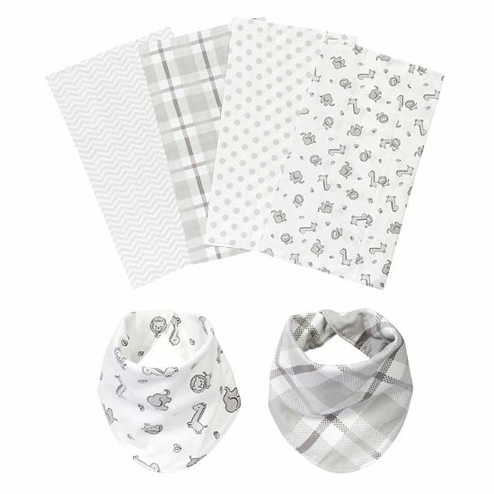 - 6-piece set includes: 2 bibs & 4 burp cloths