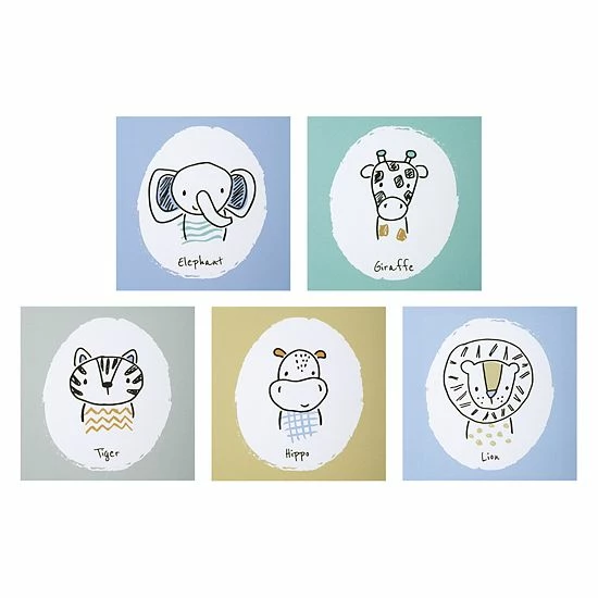 Complete the look of your baby’s room with the Safari Yearbook 5-piece Canvas Wall Art Set featuring safari animals in coloring book style portraits.