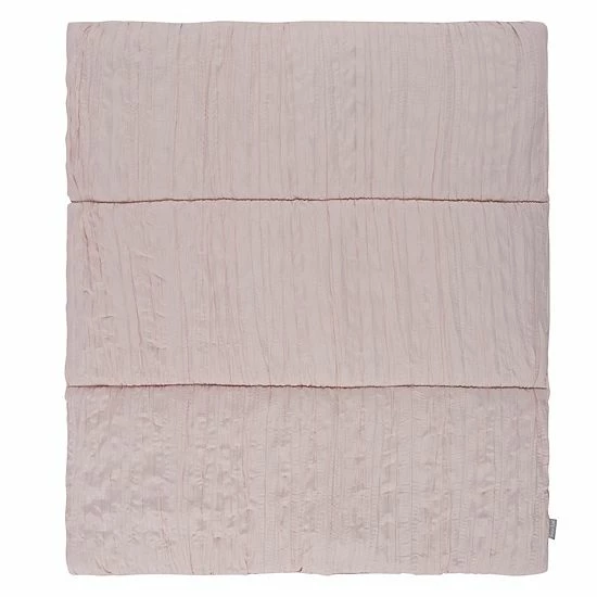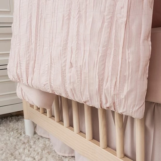 Soft blush pink fabric is sewn with elegant ruching to bring an ethereal style to a classic nursery. You could accent with pops of color or keep it simple in decor. This set offers a fresh clean welcome for your little one.