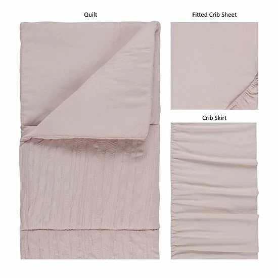 - 3-piece set includes: Crib Quilt, Fitted Crib Sheet & Bed Skirt
