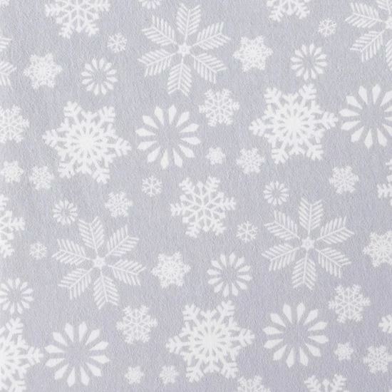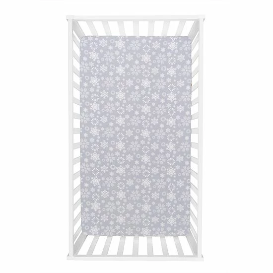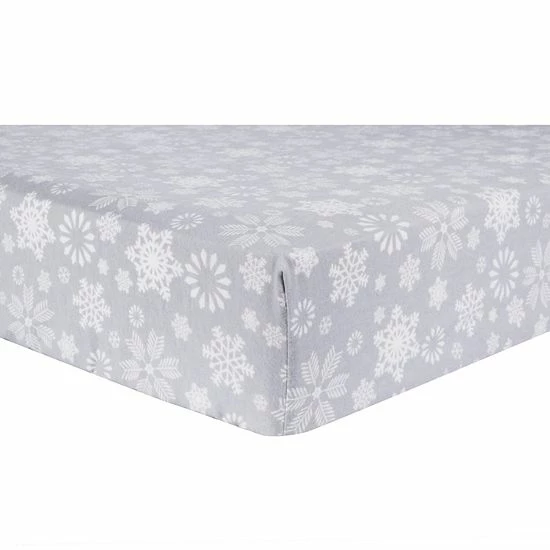 The Snowflake Flurry Deluxe Flannel Fitted Crib Sheet by Trend Lab is 100% brushed cotton and features a white snowflake scatter print on glacier gray background.