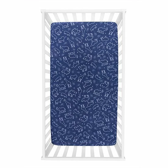 The Starry Safari Deluxe Flannel Fitted Crib Sheet by Trend Lab is 100% brushed cotton and features white safari constellations on a navy background.