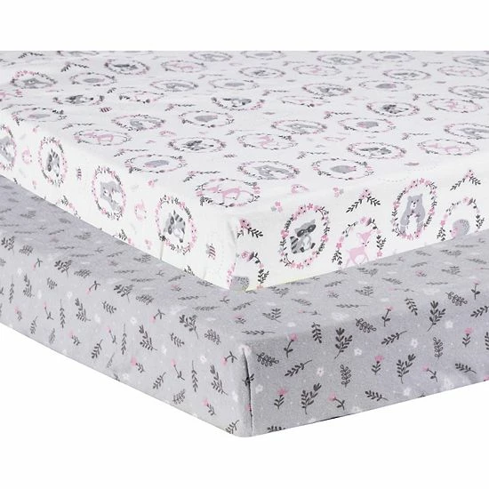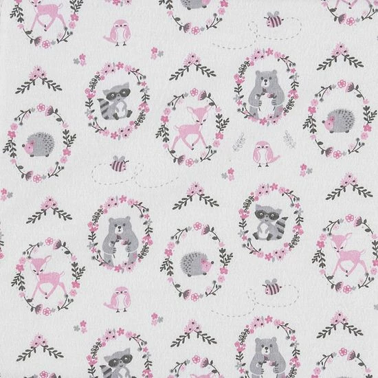 Make your little one’s playard cozy with Trend Lab’s Sweet Forest Friends 2 Pack Flannel Playard Sheets. The 100% brushed cotton flannel fabric has just the right amount of padding for a little extra cushion in the playard. One features racoons, deer, hedgehogs, bears, bumblebees and birds that pose in floral silhouettes in a fairytale and mauve pink, with glacier and cool gray accents. The other features a dainty floral print in mauve pink, fairytale pink, cool gray on a glacier gray background.