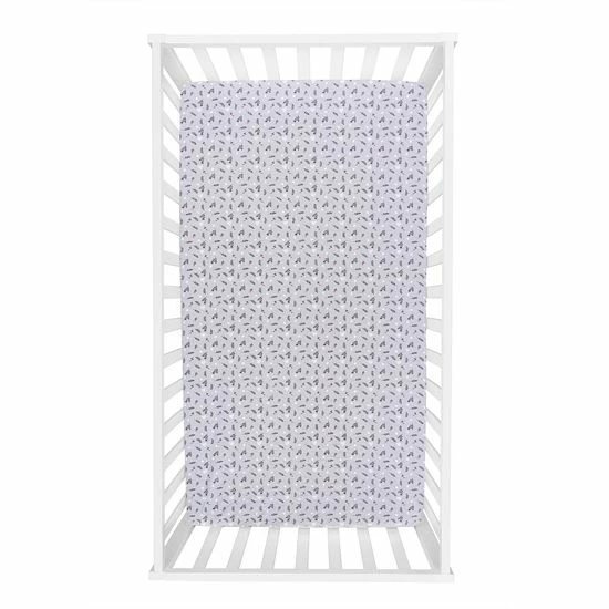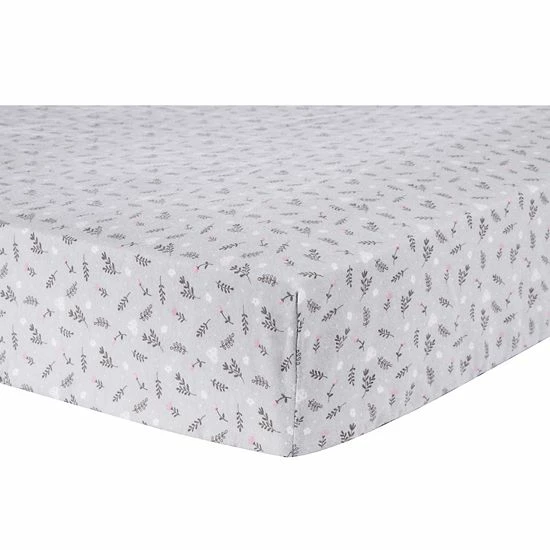 The Gray Prairie Deluxe Flannel Fitted Crib Sheet by Trend Lab is 100% brushed cotton and features a dainty floral print in mauve pink, fairy-tale pink, cool gray on a glacier gray background.