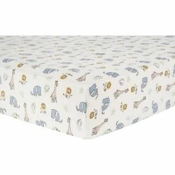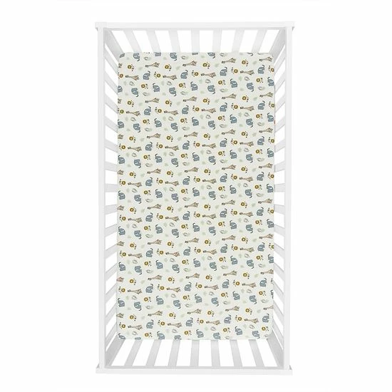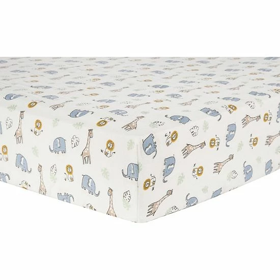 The Tanzania Deluxe Flannel Fitted Crib Sheet by Trend Lab is 100% brushed cotton and features a safari animal and leaf illustrated print in a combination of sage green, blue, gold, beige and bedtime gray.