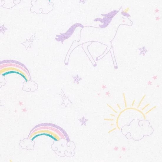 - A whimsical scatter print of unicorns, rainbows and sunshine in purple, yellow, teal, pink and white
