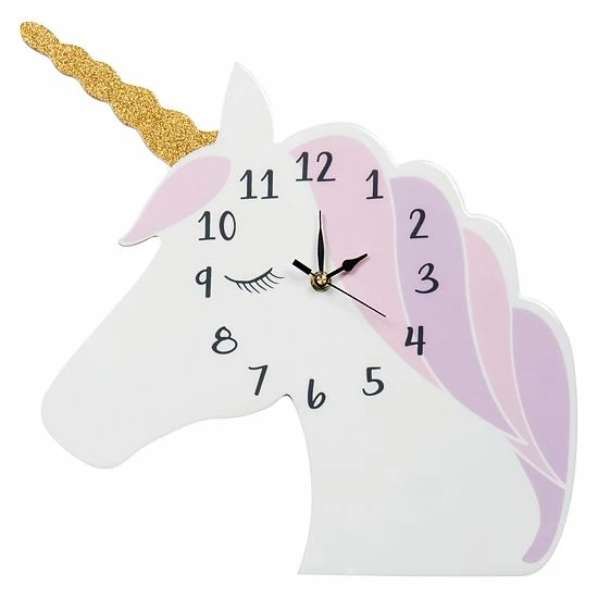 Complement any room with the stylish Unicorn Clock by Trend Lab. This sweet unicorn shaped clock features a light pink and lavender mane with a sparkling gold glitter horn. Dark gray numbers add the finishing touch. Mounting hardware is attached to the back for easy hanging. Runs on one AA battery (not included). Clock measures approximately 14 1/2 in x 15 in.