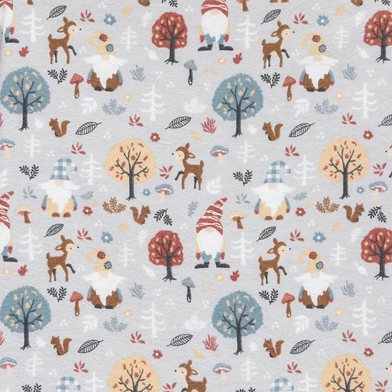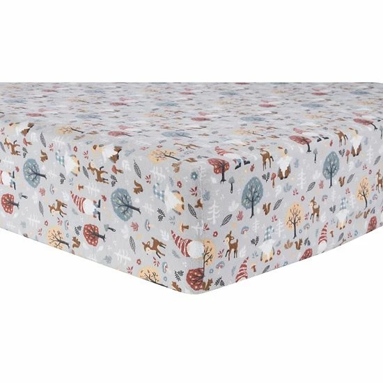 The Woodland Gnomes Deluxe Flannel Fitted Crib Sheet by Trend Lab is 100% brushed cotton and features gnome buddies wandering through the woods in a wintery color palette of red, glacier gray, tan, muted blue, beige and brown.