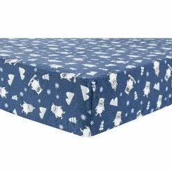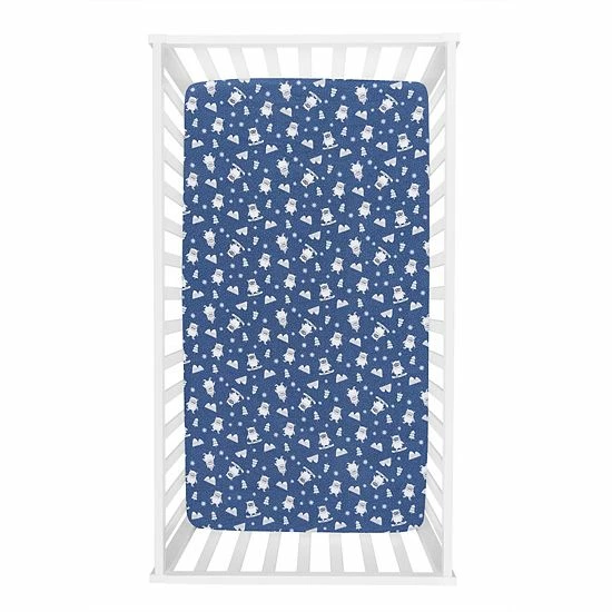 The Yeti Deluxe Flannel Fitted Crib Sheet by Trend Lab is 100% brushed cotton and features an adorable snowboarding yeti getting ready to hit the slopes. The print includes glacier gray mountains, sky blue trees, and white snowflakes on a navy background.